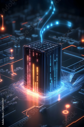 Futuristic data cube processing information on circuit board; glowing lines represent data flow; background shows intricate technological details; ideal for tech websites and presentations