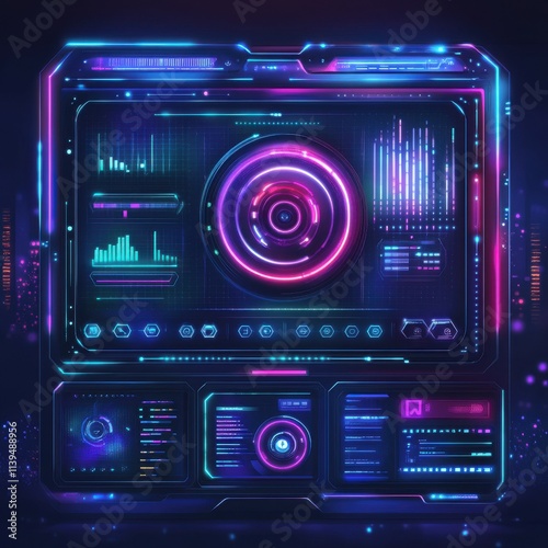 Futuristic data dashboard with vibrant neon colors and holographic elements, showcasing graphs and analytics.