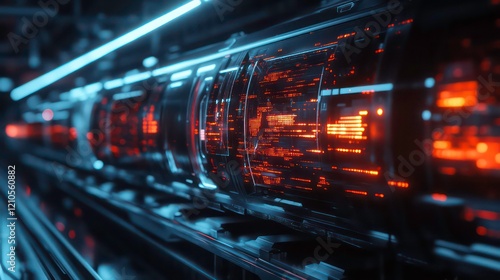 Futuristic data stream flowing through transparent tubes with glowing orange and blue lines.