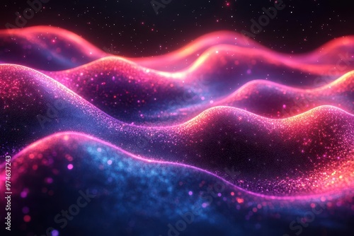 futuristic data stream visualization abstract pink purple and blue neon lines forming dynamic wave patterns against dark background conveying highspeed information flow