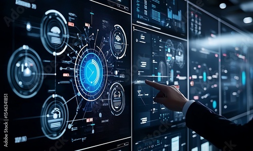 Futuristic Data Visualization Interface with Interactive Elements and User Engagement in Digital Analytics Environment