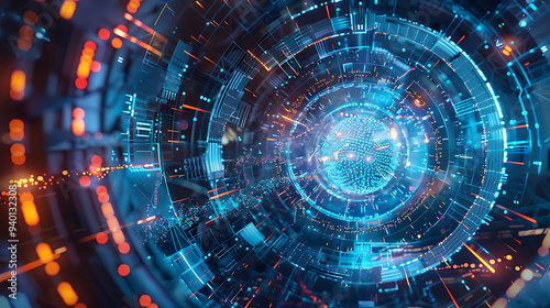 Futuristic depiction of a particle accelerator studying the interactions of atomic particles including quarks and protons