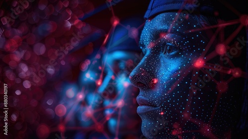 Futuristic depiction of human faces integrated with digital technology and neural networks, symbolizing AI and advanced data analysis.