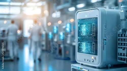 Futuristic depiction of quantum computing revolutionizing the manufacturing of portable dialysis machines Advanced digital technology automation and innovation transforming medical device production