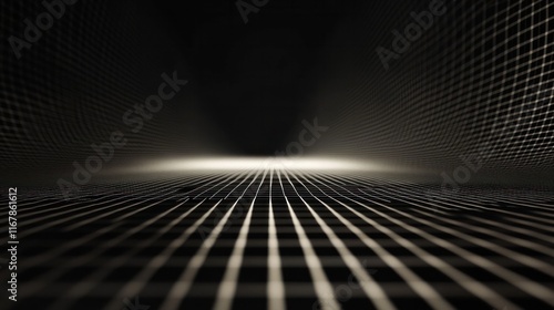 Futuristic digital abstract background with a minimalist grid pattern and lines in a dark monochrome color scheme creating an architectural and technological feeling of depth and space