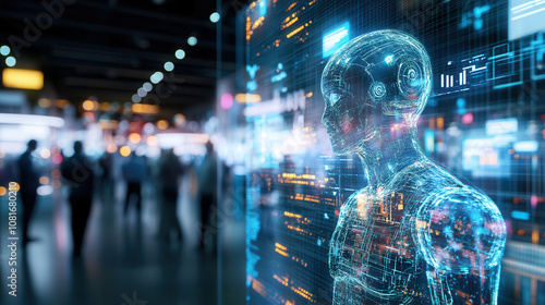 Futuristic digital art featuring holographic humanoid figure with glowing circuits, set in bustling technological environment
