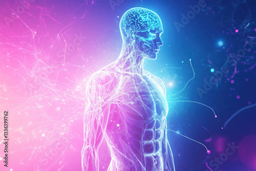 Futuristic digital artwork of a glowing human figure with neural connections, symbolizing AI and biology