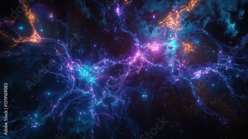 Futuristic digital artwork showcasing artificial neural network with glowing nodes and electric blue neon purple energy