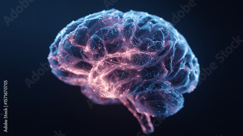 Futuristic digital brain made of glowing data particles with AI letters. Concept of artificial intelligence, neural networks, and advanced technology. Vector illustration on blue background.