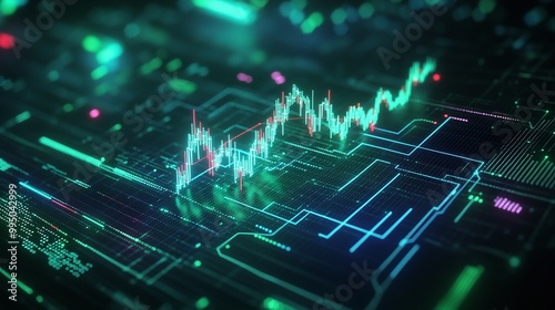 Futuristic digital chart with vibrant green and blue data graphics on a dark background.
