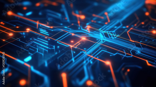 futuristic digital circuit board with glowing blue and orange lines represents advanced cyber technology and digital transformation