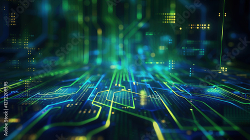 Futuristic digital circuit board with glowing lines and patterns, showcasing technology and innovation in vibrant blue and green color scheme