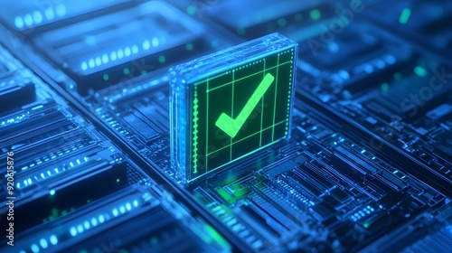 Futuristic digital concept with green checkmark on a glowing circuit board, representing system verification and technology assurance.