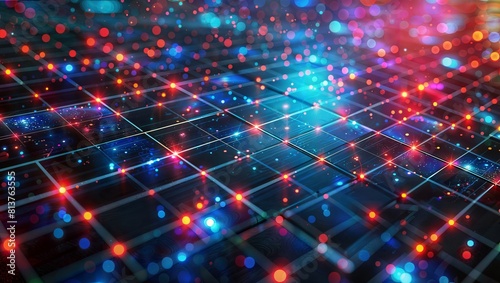 Futuristic digital cyberspace background with glowing particles and grid lines interconnected, representing advanced technology, network, or artificial intelligence.