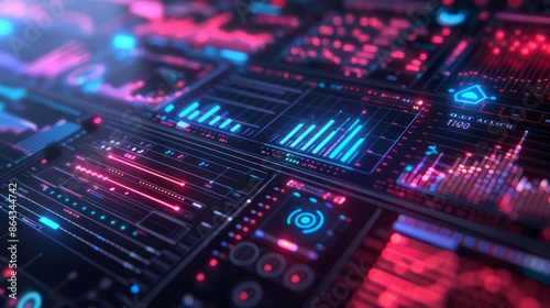 Futuristic digital dashboard with dynamic data visualization in vibrant neon colors, depicting advanced technology and data analytics interfaces.