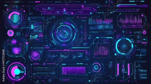 Futuristic digital dashboard with glowing interface elements. Various data visualizations and indicators