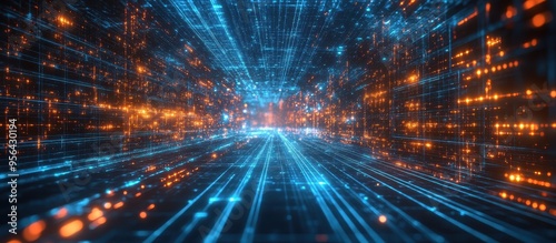 Futuristic Digital Data Stream with Glowing Blue and Orange Lights in a High-Tech Virtual Environment