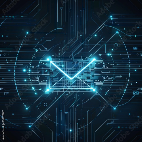 Futuristic digital email icon surrounded by a blue glowing circuit network, representing modern communication technology.