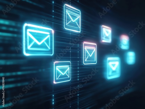 Futuristic digital email icons glowing in a dark space, representing communication and technology advances in the digital age.