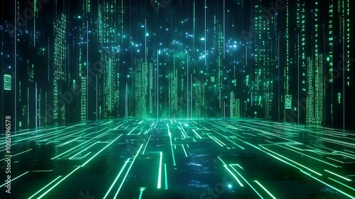 Futuristic digital environment with glowing green lines and data streams on a dark background.