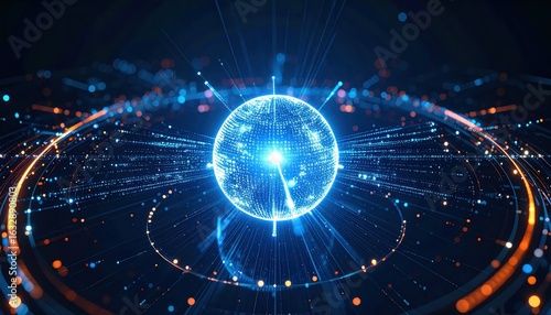 Futuristic digital globe with glowing connecting lines and data points over a dark background representing global technology and digital connectivity