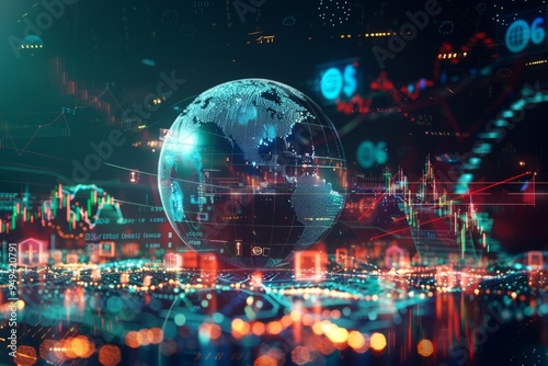 Futuristic digital globe with glowing connections and financial data, representing global connectivity, finance, and technology
