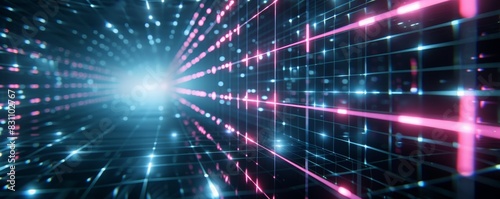 Futuristic digital grid with glowing lines and light effects, representing technology, data, and innovation in a cyber environment.