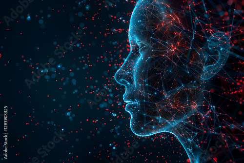 Futuristic digital human head profile with glowing neural network lines technology concept for AI machine learning visualizations