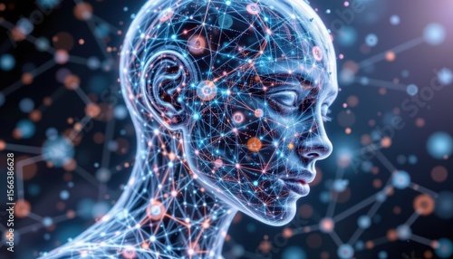 Futuristic Digital Human Portrait with Abstract Neural Network Connectivity Visualization