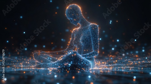 Futuristic Digital Humanoid in Meditative Pose with Glowing Particles and Lines