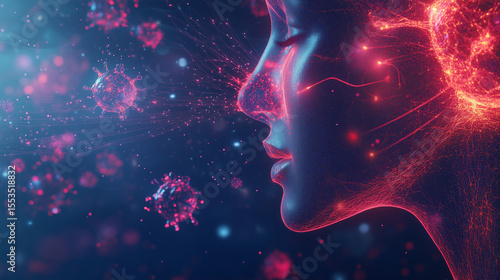 Futuristic digital illustration showing a human face interacting with airborne viruses, highlighting sensory neural connections in the nasal area.