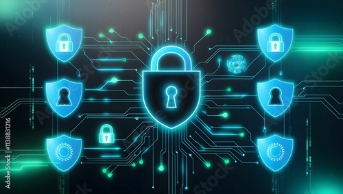 Futuristic Digital Image Representing Web Security and Cybersecurity with Glowing Padlocks, Shield Icons, Keyholes locks and Digital Circuit Lines, Featuring Dark Background