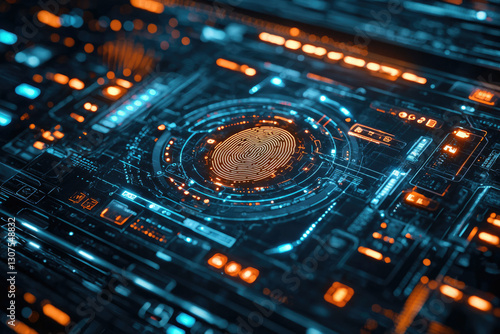 Futuristic digital interface displaying a fingerprint scan for biometric security authentication.