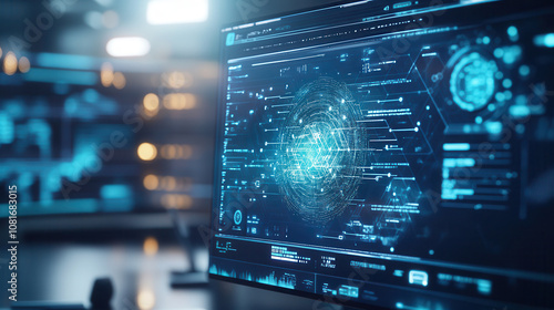 Futuristic digital interface displaying complex data visualizations and analytics, showcasing technology and innovation in modern workspace
