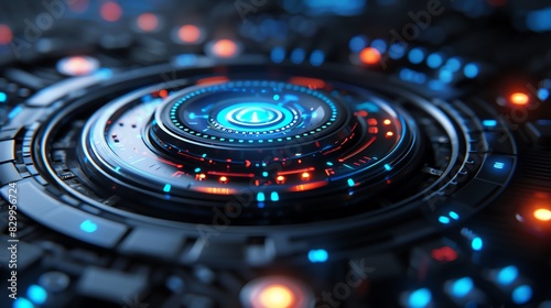 Futuristic digital interface, glowing in blue and red lights, capturing the essence of advanced technology and innovation.