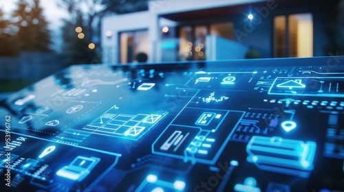 Futuristic digital interface showcasing smart home technology and connections, blending innovation with modern living.