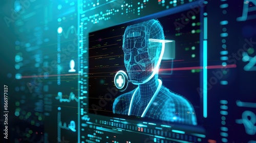 Futuristic digital interface with artificial intelligence and 3D human figure, representing advanced technology and data analytics.