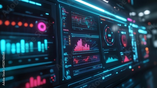 Futuristic Digital Interface with Colorful Graphs and Data Displays