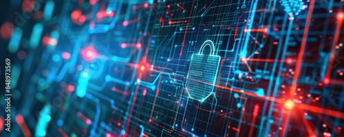 Futuristic digital interface with cybersecurity elements, showcasing data protection and network security, ideal for tech-related projects.