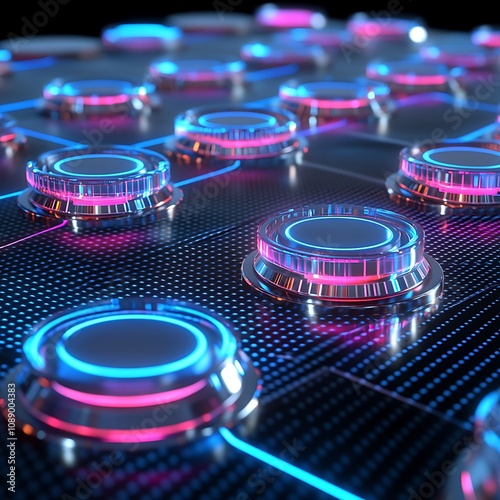 Futuristic Digital Interface with Glossy Buttons in Neon Blue and Pink Colors Displayed on a Dark Background for Tech and Gaming Themes