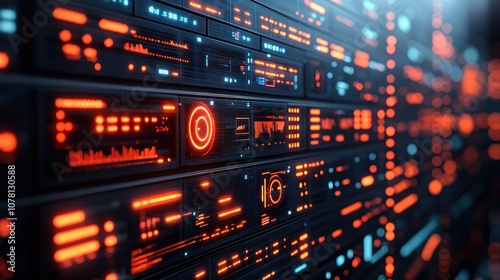 Futuristic digital interface with glowing data panels and graphics.