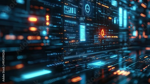 Futuristic digital interface with glowing elements and data visualizations, perfect for technology and innovation themes.