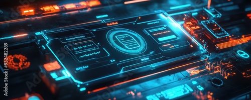 Futuristic digital interface with glowing elements, showcasing advanced technology and data visualization in a sci-fi environment.