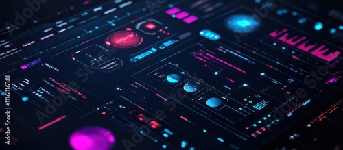 Futuristic digital interface with glowing graphs, charts, and data points.