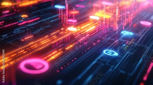 Futuristic digital interface with glowing neon data streams and floating holographic icons in vibrant blue, pink, and orange colors evoking a sense of advanced technology and innovation