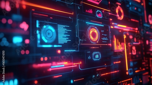 Futuristic digital interface with glowing neon lines and data visualizations, representing technology and information flow.