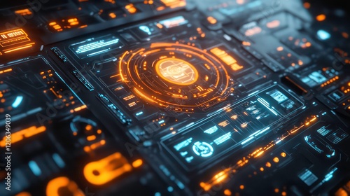 Futuristic digital interface with glowing orange and blue elements.