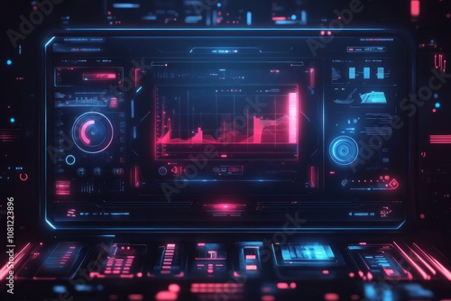 Futuristic digital interface with glowing pink and blue lights and a graph on the screen.