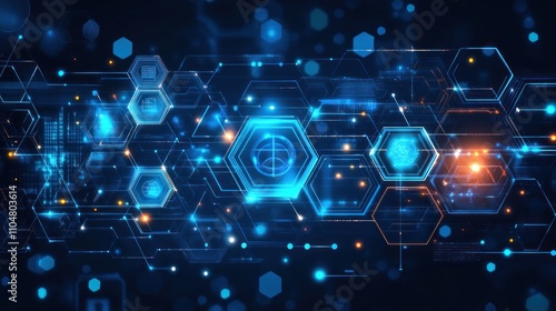 Futuristic digital interface with hexagonal patterns and glowing elements.