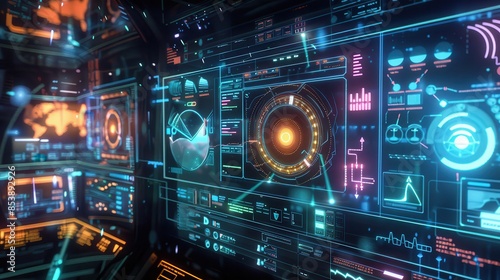 Futuristic digital interface with vibrant holographic elements, showcasing advanced technology and data visualization in a high-tech environment.